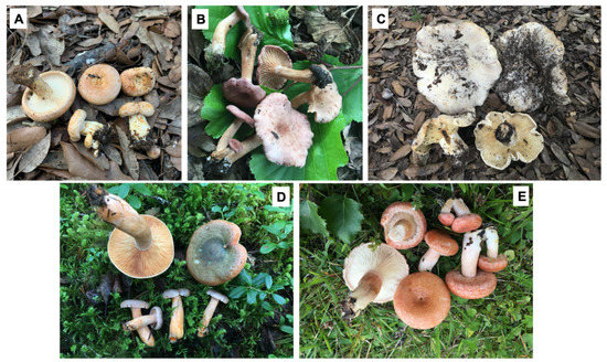 Some of the species of milkcaps assessed in various Red Lists of macrofungi. (A) Lactarius mairei; (B) Lactarius lilacinus; (C) Lactifluus vellereus; (D) Lactarius fennoscandicus; (E) Lactarius torminosus. (A–C), various locations in Sardinia, Italy. (D,E), different locations in central Sweden.