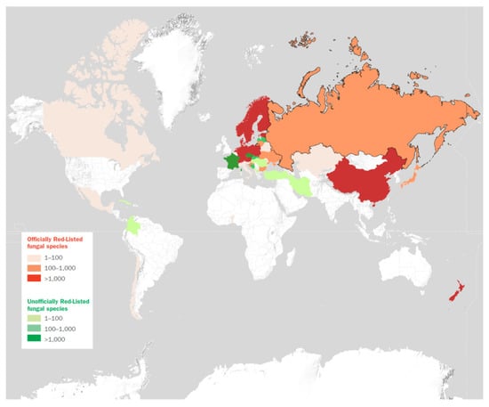Countries with published national fungal Red Lists. For more details, see https://stateoftheworldsfungi.org/ (accessed on 7 May 2021). Reprinted with permission from [31]. Copyright 2018 The Board of Trustees of the Royal Botanic Gardens, Kew.