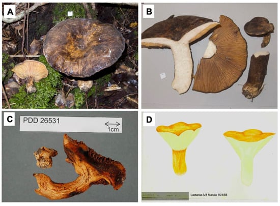 New Zealand’s threatened milkcaps. (A) Lactarius novae-zelandiae in habitat; (B) L. novae-zelandiae, preserved specimen (New Zealand Fungarium, PDD 106047); (C) Lactarius maruiaensis, holotype (New Zealand Fungarium, PDD 26531); (D) L. maruiaensis, drawing of holotype (New Zealand Fungarium, PDD 26531). Reproduced with permission. Copyright: (A,B,D), Jerry Cooper/Landcare Research New Zealand Limited; (C), Landcare Research New Zealand Limited.