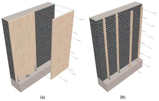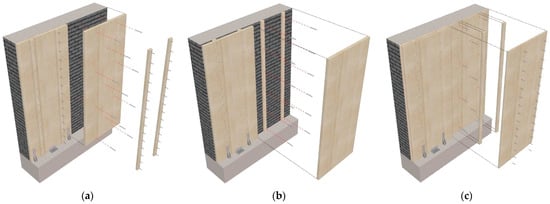 Timber-based hybrid solutions: (a) Timber panels fixed to the wall and strong-backs applied to the panel surface; (b) strong-backs fixed to the wall and timber panels fixed to the strong-backs; (c) timber panels fixed to the wall and strong-backs and additional panels fixed to the first layer of panels.