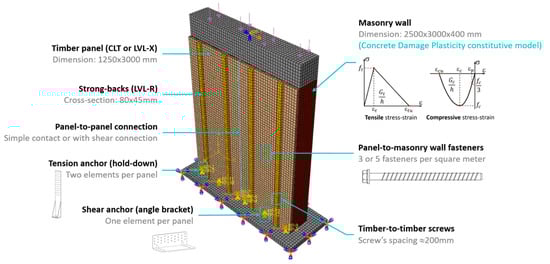 A concrete base and a concrete beam at top of the wall (cross section 400 mm × 400 mm) were modelled using an elastic and isotropic material, to facilitate the transfer of the loads to the masonry wall. A tie constraint was used to model the surface-to-surface connection between masonry and concrete to prevent any relative displacement. Timber was discretized as an orthotropic material where inelastic phenomena, such as local crushing at the panel’s toe, were simulated using a plastic constitutive model. The CLT panel was implemented as a three-layer solid, with the two external layers oriented vertically and the inner layer oriented horizontally. The LVL panel was instead modelled with an equivalent homogeneous material. The CLT panels were modelled using the properties of C24 solid timber [23], while the equivalent homogeneous properties of the LVL panels were selected according to [39].
