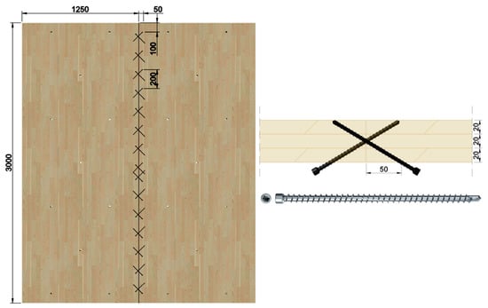 Layout of the timber screws in the panel-to-panel shear connection (dimensions in [mm]).