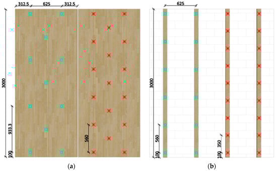 Fastener layout for the fixing patterns with 3 (in green) and 5 (in red) fasteners per square meter: (a) fastener layout for panel-to-masonry wall connection; (b) fastener layout for strong back-to-masonry wall connection.