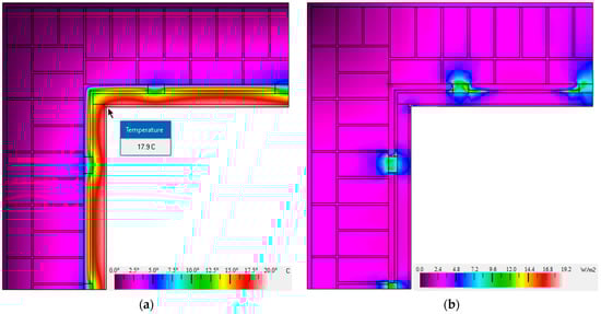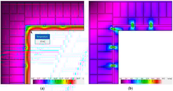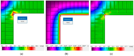 The thermal bridge in correspondence of the corner of the retrofitted walls was evaluated using the finite elements software THERM. The results were obtained by studying a 400 mm thick clay brick wall. Figure 6, Figure 7, Figure 8, Figure 9, Figure 10, Figure 11 and Figure 12 show the trend of the infrared (IR) temperature and the heat flux, while the linear transmittance and the internal temperature of the wall corner are indicated in each figure caption and then summarized in Table 11. The heat flux results for the masonry wall corner with no retrofit are reported in Figure 6a. The comparison between Figure 6a,c shows that a single CLT panel (CLT_1v) can generate an increase in the corner temperature from 13.3 °C to 15.4 °C (in the winter period), limiting the heat loss and the unevenness caused by the mortar layers.