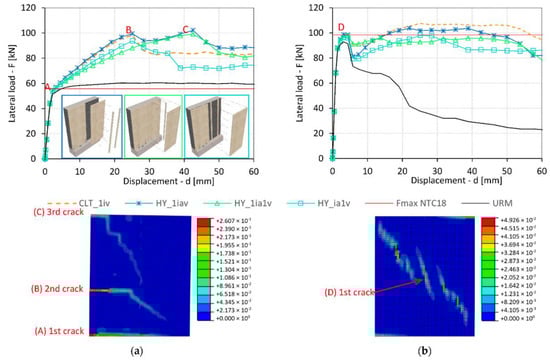 The initial branch of the lateral load–displacement curves of the retrofitted walls matched that of the unreinforced wall for both boundary conditions, confirming what reported by [5,8], that in the first phase of the loading the behaviour of the retrofitted system is governed by the masonry wall response. The contribution of the retrofit becomes noticeable after the onset of the first crack (see point A and point D). The HY_1iav solution appeared to be the most effective retrofit for improving the rocking behaviour. In addition to point A, points B and C are isolated on the lateral load–displacement curve of the rocking wall retrofitted with HY_1iav. Point B indicates the formation of the second crack, while point C marks the reaching of the peak lateral capacity of the retrofitted wall (102.17 kN, 43 mm) and the occurrence of the third crack. When compared to the URM configuration, an increase in lateral load capacity of 69% was noticed at a drift value of 1.43%. It can be observed that for the shear responding wall, the application of the retrofit had an appreciable impact only on the displacement capacity (drift ≥ 1.5%). The response curves present a small decrease in the shear capacity as soon as the wall starts cracking (point D) followed by a strength regain and a further increase. This phenomenon is due to the stiffness of the timber-to-masonry connection, requiring a 7 mm wall displacement to engage sufficient fastener shear strength to further increase the global lateral capacity. The CLT_1iv and the HY_1iav appeared to be the most effective solutions, with an increase in load bearing capacity larger than 10%.