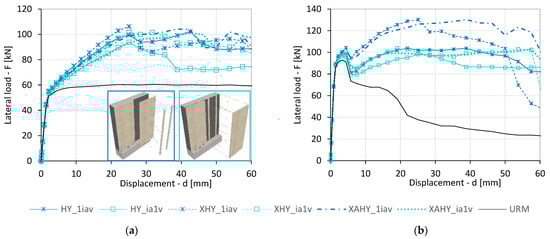 Figure 14 presents the behaviour of masonry walls retrofitted with the hybrid solutions HY_1iav and HY_ia1v, accounting for the effect of the panel-to-panel side connection where fully threaded timber screws are inserted at an angle of 45° to the joint line (see Figure 4). Two sub-configurations were studied, depending on whether the base anchors (i.e., hold-downs) at the location of the panel-to-panel joint are present (letter “X” added to the labelling system) or not (letters “XA” added to the labelling system). It can be observed that for both rocking and shear cases, the lateral capacity of the X solutions is slightly smaller than that of the XA solutions. Regarding the displacement capacity, it is worth noting that in the case of wall shear failure, the X configurations showed noticeably larger values than the XA solution.