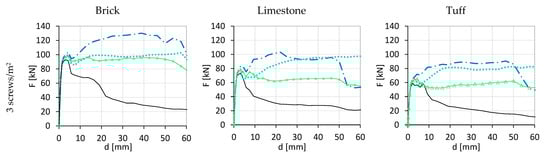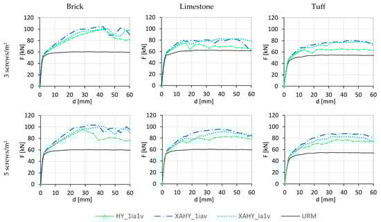 Figure 15 and Figure 16 report the capacity curves of retrofitted walls characterized by different masonry properties and number of timber-to-masonry connections. For both failure modes, the hybrid solution with the timber panels close to the wall (XAHY_1iav) resulted in the most effective. For the rocking behaviour, an increase in the number of fasteners does not produce appreciable variations in the lateral strength if the masonry has good mechanical properties (e.g., clay brick walls). On the contrary, for masonry with poor mechanical properties (e.g., tuff walls), an increase in the fastener number generates a noticeable improvement of the effectiveness of the retrofit. The increase in lateral load capacity due to the XAHY_1iav solution ranged between 30% and 60% in the case of 3 fasteners/m2 and between 60% and 70% in the case of 5 fasteners/m2. Increasing the number of fasteners in the walls responding in shear provides more pronounced increases in the lateral load capacity when the masonry quality is poor, similarly to what was observed for the rocking walls. The retrofit solution XAHY_1iav produced increases in the lateral load capacity between 40% and 60% in the case of 3 fasteners/m2 and between 40% and 80% in the case of 5 fasteners/m2. The solution HY_1ia1v was found to be the least effective, particularly in shear (appreciable increase of the displacement capacity only), due to the absence of the panel-to-panel side connection.