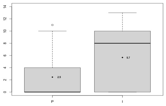 Figure 1, in the form of a boxplot, better illustrates the difference between Portuguese and international chains. Looking at the upper quartile, we observe that 25% of Portuguese chains (P) scored four or more, while 25% of international chains (I) scored 10 or more. Another relevant observation is that international companies either scored zero or eight, with no scores from one to seven. This means they either had no concern about sustainability practices (or, at least, they did not communicate them) or had a nearly total commitment. Portuguese hotel chains showed a more significant dispersion in terms of engagement towards these practices, having companies that scored two, three, four, five, and six points, but also 10 or 11. The mean value for Portuguese companies was 2.5 and for international companies, 5.7. A total of 58% of Portuguese companies scored zero, and only 33% scored four or above, with a maximum value of 11, whereas 44% of international companies scored a zero, but 56% scored eight or more, with a maximum of 13. Differences between the two groups’ mean scores did not have significant statistical relevance (Mann–Whitney test, p = 0.15). However, these results suggest that international hotel chains based in Portugal tend to show more concerns about environmental sustainability issues and/or communicate them more on their websites than their Portuguese counterparts, smaller companies.
