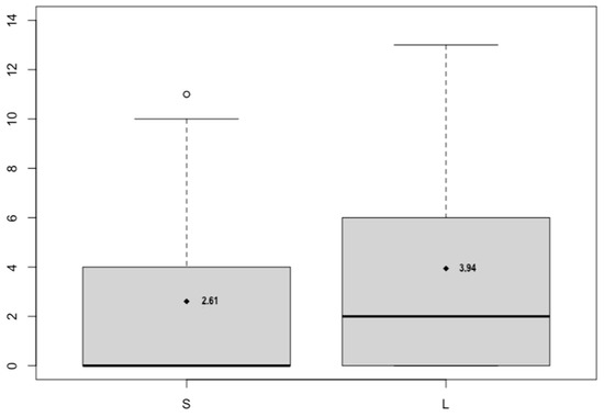 Boxplot of scores for smaller (S) and larger (L) hotel chains.