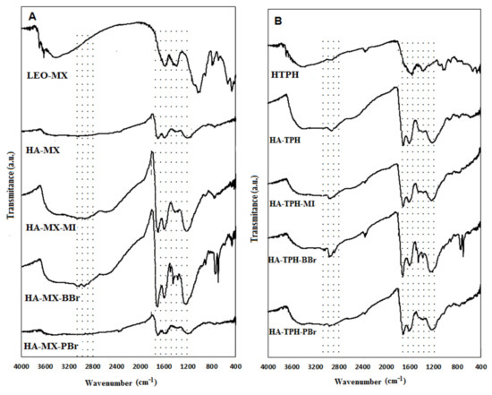 FTIR spectra of humic acids. (A) Mexican leonardite (LEO-MX) and respective pure (HA-MX) and functionalized (HA-MX-MI, HA-MX-BBr, HA-MX-PBr) humic acids. (B) Humin Tech Pow Humus (HTPH) and respective pure (HA-TPH) and functionalized (HA-TPH-MI, HA-TPH-BBr, HA-TPH-PBr) humic acids.