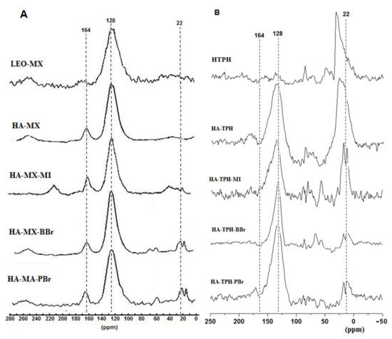 In the NMR spectra of the HA-MX, the aromatic group is centered at 128 ppm, the carboxyl at 164 ppm, and aliphatics at 22 ppm. In the case of the HA-TPH NMR spectra, the aliphatic group is centered at 22 ppm and the aromatics at 135 ppm. The alkyl halide MI gave rise to compounds derived from aldehydes and ketones, while the other two halides, PBr and BBr, generated aliphatic compounds with carbons substituted by oxygen or nitrogen (C-O, C=O or C=N). The signals in the 10–11 ppm region were identified as carbons with sp3 hybridization. In the HA-TPH, the carbonyl functional group is scarce in comparison to the corresponding one observed in the HA-MX (Figure 2B).