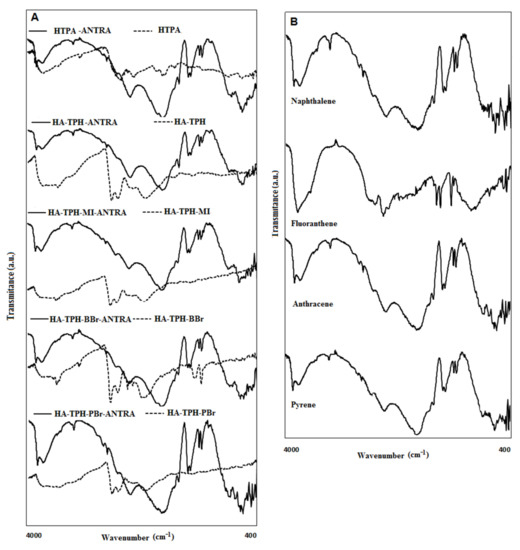 The sorption of selected PAHs in the different HAs studied (source, pure, and functionalized HAs) generated the FTIR spectra presented in Figure 3. With some variations in the number of peaks, PAHs changed the spectrum of HA. They give rise to a characteristic spectrum for the new molecular structure formed by the HAs and PAHs (HAx-PAHx), and peak intensity changed with the type of HA used as sorbent. The effect of the PAH type on the FTIR spectra of the HA-TPH functionalized with PBr (HA-TPH-PBr) is shown in Figure 3A. Figure 3B shows the changes produced by the anthracene on the FTIR spectra of the pure HA-TPH and functionalized HA-TPH (HA-TPH-MI, HA-TPH-BBr, and HA-TPH-PBr), after the sorption of these PAHs in the different HAs. The increased HA spectrum signals with PAH sorption are assigned to: 3620 cm−1 (H-bonded OH groups of alcohols, phenols, and organic acids, as well as H bonded in N-H groups), 3400 cm−1 (ν(0H) stretching motion of carboxylic and alcoholic groups), 2500 cm−1 (aliphatic C-H stretch), 1417 cm−1 (δ(CH2) motion of aliphatic groups), and 1018 cm−1 (C-O stretching observed in carbohydrates and ν (C-C) skeletal vibration of aliphatic groups) (Figure 3A) [36,37]. The spectrum signals in which a diminution was observed are as follows: 2926 cm−1 (C‒H stretching of alkyl structures), 1716 cm−1 (C=O of COOH, C=O stretch of ketonic C=O), 1601 cm−1 (aromatic C=C, C=O in amide (I), ketone and quinone groups), and 1207 cm−1 (amides and ethers). The PAHs sorbed in the LEO-MX and HTPH humic substances did not change their respective FTIR spectra; however, the HTPH spectrum presented peaks of slightly greater intensity (Figure S1 in Supplementary Materials).