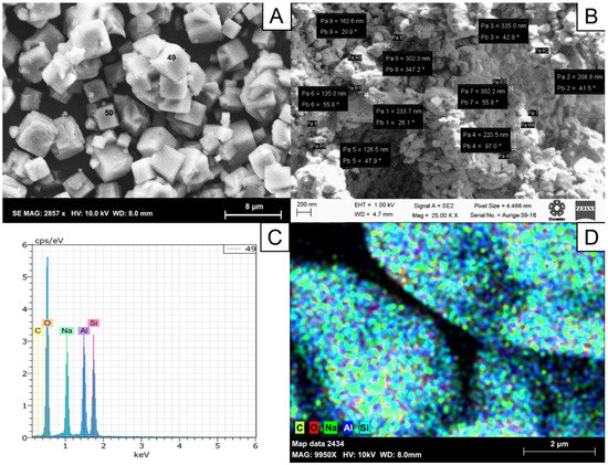 Sigma-Aldrich zeolite (<45 µm) was reduced to an average diameter of 170 ± 43 nm in 12 h, as shown in Figure 4. The grinding process was performed for 96 h; however, the particle size did not change significantly after the twelfth hour of grinding. Oxygen had the highest concentration in the zeolite (47.6 ± 6.8%) and carbon the lowest (1.83 ± 0.79%). Silica, aluminum, and sodium were calculated at percentages of 20.1 ± 0.97%, 15.9 ± 0.84%, and 14.5 ± 1.0%, respectively (Table S1 in Supplementary Materials). The color-coded (SEM) elemental composition of the zeolite is shown in Figure 4D.