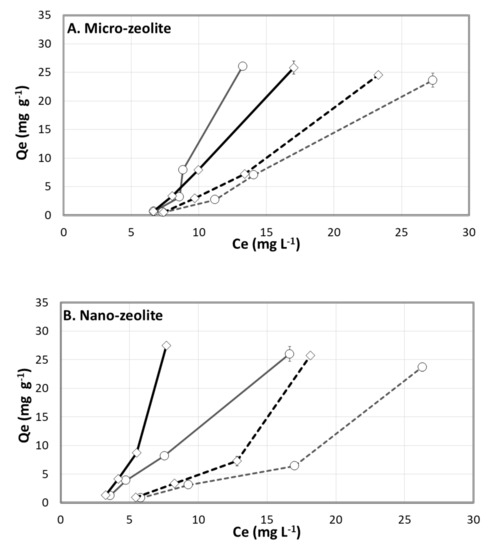Sorption in zeolite of the HA-TPH-PBr and HA-MX-PBr humic acids showed a different behavior when the zeolite size was changed from micro (<45 μm) to nanometric size (<170 ± 43 nm). HA sorption in the micro-zeolite followed a model that is closer to Henry’s linear isotherms [41]. Linear models that intersect with the positive axis of the abscissa have been previously reported by Leone et al. [42], and the positive displacement from the origin has been attributed to a rapid adsorption of the sorbent in the solid support.
