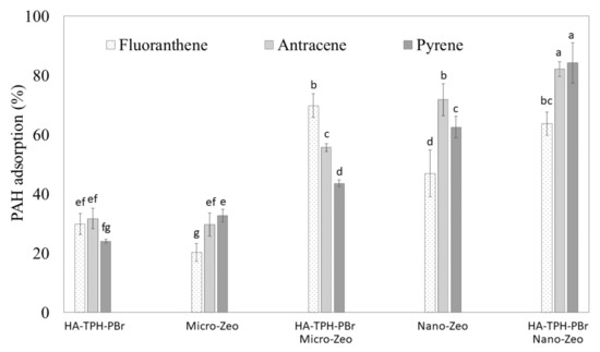 This test was performed with the HA-TPH functionalized with the PBr (HA-TPH-PBr) and the following PAHs: fluoranthene, anthracene, and pyrene. The sorption percentage of the PAHs in the micro- and nano-zeolites, alone or with the immobilized HA-TPH-PBr, is shown in Figure 6 and the mass of hydrocarbons adsorbed per unit mass of sorbent in Table 3. The HA-TPH-PBr and the micro-zeolite sorbed the three PAHs with an average of 28 ± 5%, and by 56.4 ± 13% when the HA-TPH-PBr had been previously immobilized in the micro-zeolite. The mean PAH sorption was increased by 16.7% when nano-zeolite was used. Anthracene and pyrene, the PAHs with the greater ring number, were sorbed by the nano-zeolite at percentages of 82 ± 1% and 84.9 ± 1%, respectively. The corresponding remaining PAH concentration was 5.3 ± 0.3 and 4.5 ± 0.3 mg L−1, from an initial concentration of 30 mg L−1.
