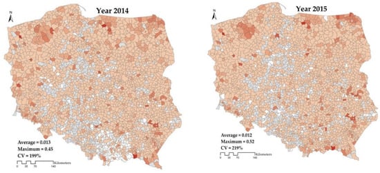 In turn, poultry breeding saw the largest scale of animal eco-production. Between 2014 and 2020, the average quantity of poultry, including broiler chickens, laying hens, ducks, turkeys, geese and ostriches, was about 16 kg per capita, with a simultaneous headage increase of 102%. However, the highest growth was noted in the headage of horses, 164%. In turn, a considerable drop in the ecological breeding of animals was observed for the headage of pigs (porkers, sows), i.e., of 65%, as well as the headage of deer (red deer and sika deer) and European fallow deer, i.e., of 76%, for which significant commune variation was also noted (CV = 1740%). A more than 10-fold increase in organic honey production was observed, although its average quantity per capita was 0.04 kg. Meanwhile, cheese and butter had the highest output at more than 220 kg per capita, Table 1.