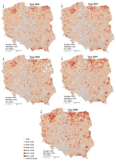 Meanwhile, the analysis revealed regional unstable shifts of organic farming over time in communes located in western Poland. This region’s ecological agriculture focuses mainly on plant production–mostly of cereals (its share of cereals in the total area of crops is the highest in Poland), pulses, fodder plants, fruit trees (plums and cherries), chokeberry and currant. Since 2014, the area’s natural assets have greatly improved—the vegetation period has become longer while emissions of air pollutants and soil contamination have decreased. Nevertheless, the conditions are still assessed as moderate for organic farming production. Agrarian structure improvement also contributes to area-related agriculture development—there are farms of relatively large surface area (from 10 to 50 ha) [78]. A rapid increase in production that applies organic methods was also encouraged by introducing considerable state financial support in the form of subsidies for farm inspection costs and farm surface areas [79].