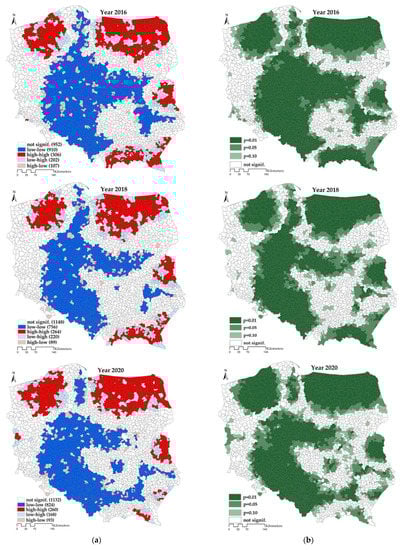 The period 2014–2020 also saw the formation of a prominent cluster of spatial dependencies among communes with low organic farming development levels (low-low cluster) running lengthwise across the country. Finally, numerous communes may also be indicated as significantly outlying the other communes around them, i.e., of untypical feature values (low-high and high-low), thus associated with locally negative spatial autocorrelations. The communes of central Poland are worthy of particular attention, showing a high level of organic farming development, but surrounded by units characterized by low variable values (high-low LISA values), e.g., the aforementioned Biłgoraj commune (see Section 3.2).