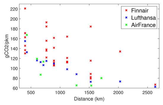 This variability of CO emissions as a function of the individual flight characteristics is illustrated in Figure 1, where the emissions per Passenger-Kilometres (pkm) as a function of distance were calculated using CO-calculators provided by different airlines [43,44,45]. As presented, for the same route (distance), the CO emissions estimated can double depending on the calculator and/or on the aircraft model. While the AirFrance and Lufthansa CO calculators use average values of emissions, Finnair offers a much more precise calculator, based on the actual cargo, passenger and fuel consumption data for Finnair’s air transportation in the previous financial year. The fuel consumed is calculated for each flight in relation to the weight of the cargo and passengers [44]. The calculator considers the specific aircraft type flown by Finnair on the route. For example, on a Helsinki to Amsterdam flight, CO emissions could vary from 89 g/pkm with an Airbus A320-214 to 185 g/pkm with an Embraer E190.