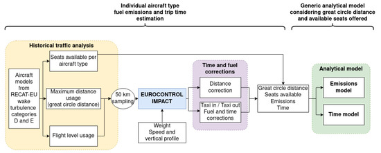 Future work should improve some parts of the modelling, in particular the consideration of the total door-to-door trip time, studying more precisely the airport access and egress times and airport processes and buffers, which could then be incorporated into the analytical model. A more detailed study of taxi time might also be worth exploring. Large airports tend to have longer taxi times, but generally offer longer flights, while regional airports would have shorter taxi times and shorter flights. Finally, more aircraft types could be taken into account to obtain a more precise model. In particular, this paper focused on jet aircraft, while different emissions and time models might be required for turboprop aircraft, which tend to show higher fuel efficiencies, but are seldom used due to other operational aspects (lower operating speeds and capacities) [61,62].
