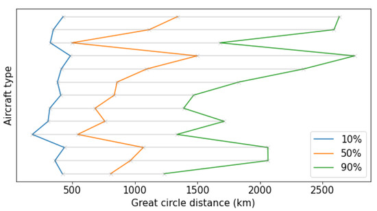 In order to estimate the time and emissions, first, the different distances between possible origins and destinations in GCD were sampled. For each of these distances, a microscopic emissions model was used to estimate these performance parameters. Therefore, the first consideration was to identify for each aircraft type the domain of usage. Figure 3 presents the 10th, 50th and 90th percentile of the distance between the origin and destination (measured as the GCD) for the different individual aircraft types considered in CAT D and CAT E. As observed, the 90th percentile of distance varied per individual aircraft type, being always lower than 2800 km, and only for a couple of models was it above 2500 km. Given that 2500 km is also commonly considered as a limit for medium-haul flights [34], this was the maximum distance for the analytical model, and the 90th percentile of distance would provide for each aircraft type the maximum GCD to be considered. As for the minimum distance, it was chosen as 200 km, both for the model and for all aircraft types, based on Figure 3.