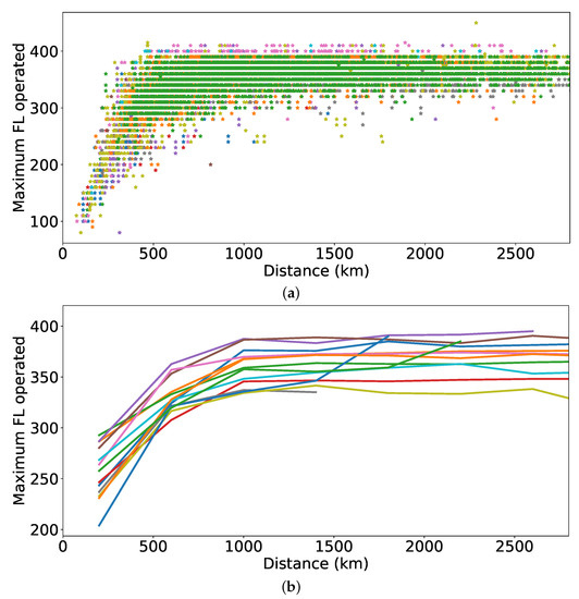The performance of the aircraft will vary as a function of some operational parameters and crucially the Flight Level [46]. As shown in Figure 4, for the same aircraft type and distance, different FL could be operated. To provide a suitable FL, the mean maximum operated FL every 400 km was computed considering the flight levels used by all the individual flights. It is worth observing how even if the historical selected FL per flight might differ for the same distance to be covered, when the mean was estimated, the flight level tended to present few variations and be rather constant after covering some short distances (lower than 1000 km), for which an optimal flight level cannot be reached. This emphasises the underperformance on very short flights as optimal flight levels cannot be reached.