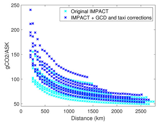 Figure 6 shows in blue the results obtained with IMPACT for Category D aircraft with the assumptions presented in Section 3.1, once the distance correction had been applied to the GCD and the fuel corresponding to taxiing had been added (as described in Section 3.3). It can be seen how distinct models followed different lines: since each model would have a specific fuel burn rate, different FL could be used and different seats available. The blue line corresponds to the mean value of emissions for all Category D aircraft considered here. Even though it only represents a small set of aircraft types, this mean value helps to identify the general tendency of emissions versus distance.
