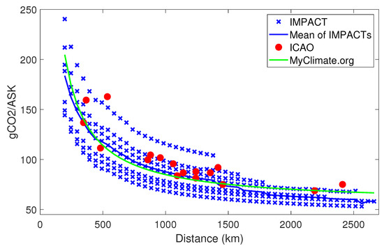 We also compared our results with the analytical model used by MyClimate.org, (accessed on 14 September 2021) (green line) [34]. Their original model considered some specific parameters to take into account all sources of CO. Here, to obtain emissions/ASK, and not per PAX, and to properly compare their model to our calculation, we neutralised some of them, such as the passenger load factor, the cargo factor, the cabin class weighting factor, the multiplier factor accounting for potential non-CO effects, the CO emissions factor for preproduction jet fuel and the airport infrastructure emissions. Again, a very good agreement was found between the MyClimate model and our mean result from IMPACT. This can be explained by the fact that both use BADA for the fuel burnt estimation even though, in Figure 6, we averaged the results for all Category D aircraft, whereas MyClimate.org uses an average seat number fixed to 153.51.