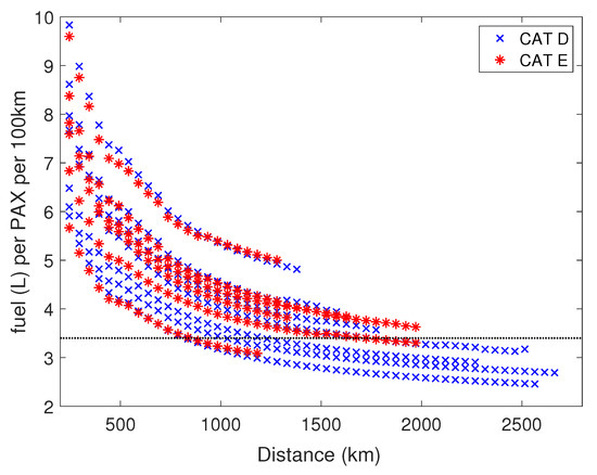 Figure 7 shows the fuel consumed per passenger per 100 km ratio as a function of the distance flown. Only for this figure, emissions were considered per PAX, and not per ASK; thus a load factor of % and a PAX to freight factor of % were considered [32,53]. As expected, very short flights presented lower performances; for flights under 1000 km, the fuel per passenger lied between 5 L and 6 L per 100 km. Medium-haul flights reached an average close to the value of 3.4 L of fuel per passenger per 100 km, which is the ratio stated by EUROCONTROL from the 2019 data [53], represented in this figure by a discontinuous horizontal line. This mean value has shown a steady improvement over the last 15 y, but hides the difference between very short flights, for which the fuel burnt during the taxiing, take-off and landing cycle is the major component of fuel consumption, and more efficient medium-haul flights.