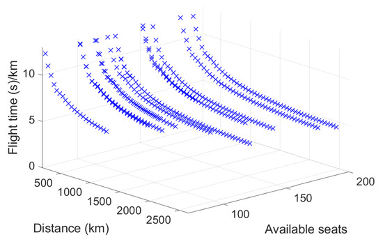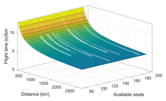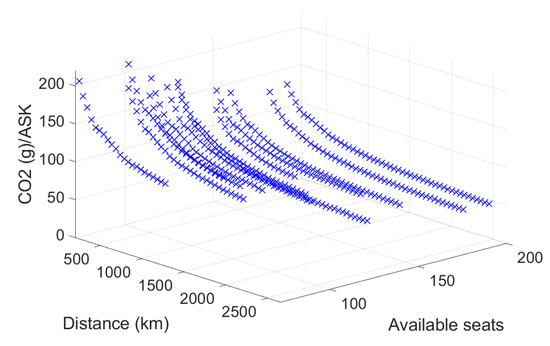 Finally, to consider the number of passengers who can be transported, the average available seats for each aircraft type in Table 1 were extracted from [49]. The models considered here ranged from 72 to 190 available seats, which corresponds to the number of seats for which the model proposed in Section 3.5.2 is valid.