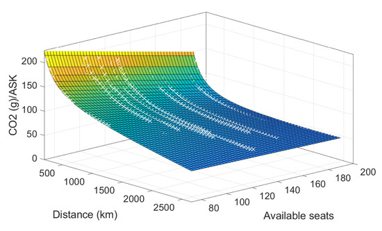 The blue crosses refer to the discrete data obtained after applying the correction factors in Section 3.3 to the IMPACT calculations performed with the assumptions of Section 3.1. A steep increase of gCO/ASK was observed for short distances, as well as a more moderate increase for a low number of available seats.