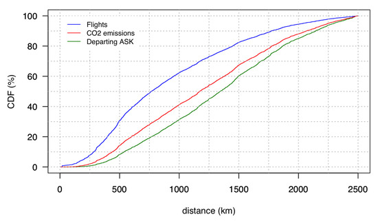 The first relevant observation is that flights below 750 km accounted for a significant percentage (48.8%) of the subset analysed, but were not significant when analysed in terms of capacity (ASK), accounting for only 19.1%. These flights were inefficient in terms of capacity and emissions (gCO) because for a given distance value, the cumulative percentage of emissions was higher than the cumulative percentage of capacity. Moreover, most of these flights were located in territories with land accessibility, and some had other transport alternatives. The second observation is that in the first part of the distribution, up to 750 km, the ASK CDF evolved much more slowly than the emissions CDF, until the difference stabilised in the flight range between 750 km and 1500 km. In the last part of the distribution, in particular above the 2000 km range, the number of flights was lower, but they added more capacity than emissions in the relative values. This reinforces the argument that very short-haul flights provide little capacity to the system, but comparatively generate high levels of emissions, making them difficult to justify from an environmental point of view, except in cases where they are decisive for ensuring territorial accessibility. In particular, financing sustainable modes of transport or innovations in the field of clean propulsion in aviation with a tax on these short flights could be a transport policy worthy of an ad hoc study.