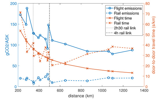 As expected, gCO/ASK was always much lower for rail than for air, but this was especially true for flights less than 600–700 km where gCO/ASK were extremely high for air due to the penalising effect of taxiing, take-off and landing fuel consumption. From distances around 700–800 km, the difference in emissions between air and rail stabilised to air emissions being around four-times higher than rail. More interestingly, travel time was seen to be equivalent for both means of transport until distances of around 600 km. Only after this value did the time travel graphs start diverging at the clear disadvantage of rail. Up until this distance, rail was clearly competitive with air from a door-to-door time point of view, with a huge advantage for emissions. Considering an average rail time per kilometre of 34.9 s/km for the routes considered in this case study, we also plotted two lines corresponding to 2 h 30 min and 4 h rail links. It can be seen that they corresponded to distances below 600 km, and thus, there was no clear time penalty in using rail instead of air. The model proposed here could be used in the future on a larger panel of routes in order to study in more detail which air routes could be substituted by rail, following time and emissions considerations.