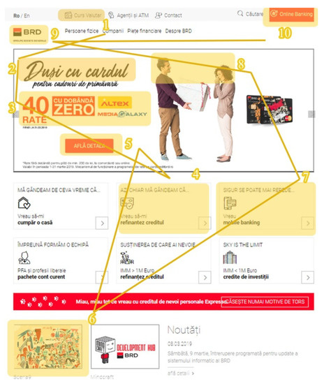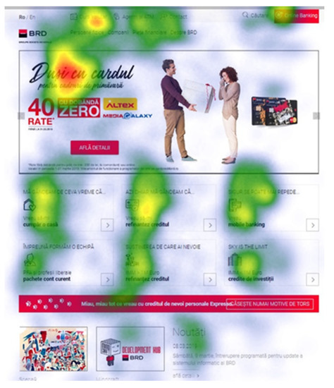 - Considering that the images (promotional banners) placed at the top of the pages were one of the most efficient elements in terms of mentioning and memorizing, it can be concluded that the information transmitted through images, in a visual form, needs a shorter viewing time in order to be memorized. Findings regarding the impact of pictures and their visibility are contrasting: several studies performed on different webpages, analyzing the eye movement and scanpaths during free-viewing or while performing a task sustain that text information is more attractive than pictures/video/graphical information [119,128,129,130,131]. The results obtained within the present study are in line with the other half of research, which considers pictures as having better visual performance on websites and in offline communications. Laeng et al. showed that while eye tracking the visual attention of consumers looking at different wine bottles, the pictures depicted by the wine labels were the ones viewed the most [91]. Pieters and Wedel [111] showed through their study that pictures always performed better and were more attractive to the users, while Wu et al. [132] argue that in situations when more images are present, the most conspicuous of them will be the ones attracting visual attention.
