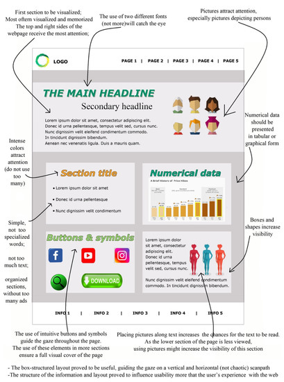 Various studies, such as Bucher and Schumacher [109], show that visual attention to information and memorization are highly influenced by layout and design. Matzen and her colleagues showed that a subject devotes a large part of their attention to text, and specifically, to the titles of each section [110]. Laeng et al. [91] and Pieters and Wedel [111] showed that pictures are the most viewed. Bonnardel et al. [112] show that colors have a determinant influence on how the users interact with a website. Having this in mind, we propose the following objective and hypothesis: