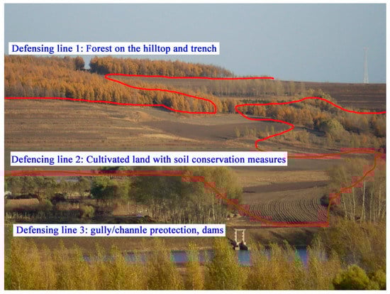 In China, a small catchment is usually regarded as a basic unit to implement soil conservation measures [24]. Since the 1980s, the three defensing lines have been constructed in the major water erosion regions in China, such as on the Loess Plateau [25] and in the purple soil region [26]. In the black soil region, Sun et al. [27] also gave an integrated management strategy, through constructing three defensing lines to control soil loss in a catchment (Figure 1). Although these soil conservation strategies have been given in these regions, quantitative analysis on the catchment management was seldom reported. Is the conservation strategy effective to control soil loss? To evaluate this strategy and to find more suitably localized control measures in a catchment, it is vitally important to further control soil loss for the black soil region.