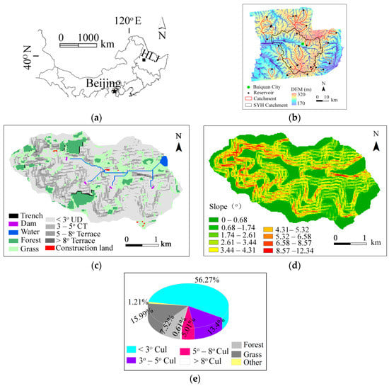 Location of the study catchment (a,b), land use type (c), catchment slope degree (d), and the percentages of land use types on different slope gradients (e). Note, (c) UD represents up-downslope cultivation, CT represents contour tillage; (e) Cul represents cultivated land, and HLJ represents Heilongjiang Province.