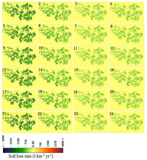 Spatial distribution of soil erosion and sediment deposition in the Qixin catchment under the 24 land use scenarios in Table 1. Note: the number represents scenario sequence. For example, 1 represents scenario 1, and 24 represents scenario 24.