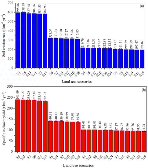 Soil erosion rate (a) and specific sediment yield (b) under the 24 land use scenarios in Table 1.
