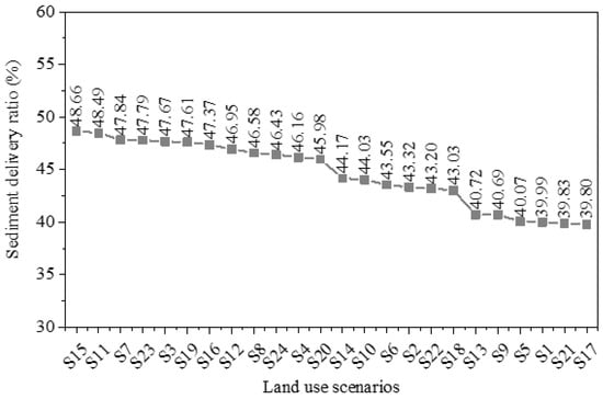 The sediment delivery ratio (SDR) is the ratio of SY-to-SLR in a catchment. Different SDRs occurred under the 24 scenarios, with values ranging from 39.83% to 48.66% (Figure 5). The changing pattern of SDRs under different scenarios is opposite to those of SLRs, i.e., higher SLRs usually corresponded to lower SDRs. The largest SDR occurred under scenario 15, and the least SDR occurred under scenario 17.