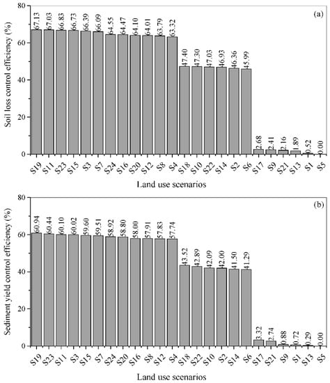 In contrast to the baseline scenario, the soil erosion control efficiencies varied from 0.52% to 67.13%, which occurred under scenarios 1 and 19, respectively. There were 12 scenarios that had above 60% control efficiencies, and 18 conservation scenarios with control efficiencies above 40%. The scenarios 1, 9, 13, 17, and 21 had lower control efficiencies.