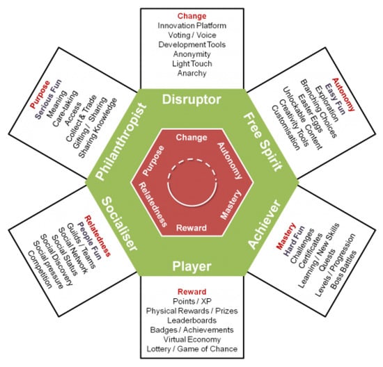 - Tondello, G.F.; Mora, A.; Marczewski, A.; Nacke, L.E. Empirical validation of the Gamification User Types Hexad scale in English and Spanish. Int. J. Hum. Comput. Stud. 2019, 127, 95–111. [Google Scholar] [CrossRef]