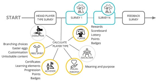 Finally, the Hexad Framework [] has been developed specifically for the design of gameful systems tailored to their users. It defines six player types, namely, the achiever, free spirit, philanthropist, disruptor, player and socializer. Research indicates that the Hexad Model outperforms the BrainHex model in detecting user preferences towards game elements []. Although the BrainHex model is often used for personalised gamified systems, it was specifically designed for game design, limiting its usefulness for gameful design. In game design, the main objective is to entertain users, whereas in gameful design, the goal is to motivate users []. Next, where the Barata Model is lacking as it is designed for education and fails to research specific game elements, the Hexad Framework solves this absence by validating specific game elements per player type. Therefore, the Hexad Framework will be used as the starting point for offering personalised gamification in a survey context.