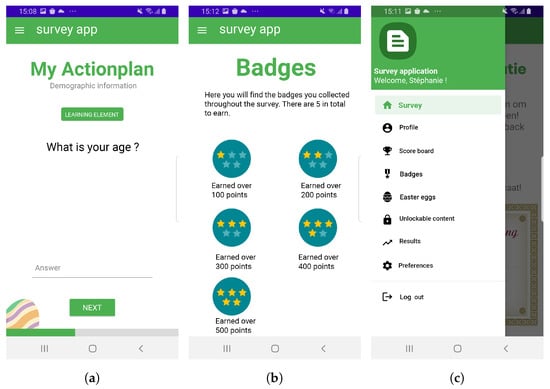 For the user tests, participants were divided into two groups. Group 1 received a version of the application that did not include any gamification, whereas Group 2 received the version including personalised gamification. Both groups had to fill in the same questionnaires, including the Hexad Player Type survey. For the proof of concept, we chose surveys situated in the healthcare domain that question the general well-being and physical activity level of people. Of course, the application can be used with other surveys from different application domains. More specifically, we used the Big Five Inventory, BFI-44, personality survey [], 44 questions determining personality according to the Big Five personality traits. Next, the My Actionplan [] survey has to be completed, gaining insight into the behavioural change and its underlying mechanisms people experience when trying to increase their physical activity. This is followed by another survey on health and exercise, developed by the Department of Physical Activity and Health at Ghent University in collaboration with the Institute of Healthy Living []. These surveys consist of Likert scale questions, open-ended questions and true/false questions. Finally, to evaluate the prototype, the user has to fill in a feedback survey, containing 6 open questions and three 5-point Likert scale questions on user experience and how long they suspect it took them to complete the survey.