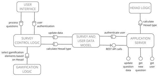 Figure 4 shows the high level overview of the different components of the system. The Hexad Logic component is responsible for the algorithm that calculates the Hexad Player Type, based on the results of the questionnaire. The Application Server component stores and updates the necessary data that is sent by the Survey and User Data Model component, which is in charge of making sure the data in the server remains up to date. The Survey Control Logic is responsible for processing the data of the survey and authenticating the user. Furthermore, it communicates with the Data Model to calculate the Hexad Player Type of the user, which is necessary for the Gamification Logic to provide the game elements tailored to the user. Separating the gamification logic from the rest of the system allows for easy additions of game elements in the future. Finally, the User Interface provides the interaction with the end-user.