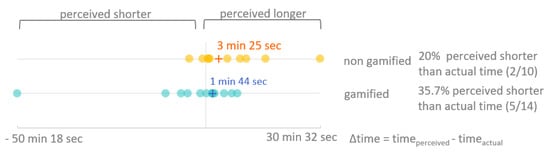 More users of the gamified application (35.7% or 5 out of 14) estimated their completion time to be shorter than it actually was, compared to the users of the non-gamified application (20% or 2 out of 10). The difference between the median of the two groups is however small: 3 min 25 s for the non-gamified group and only 1 min 44 s for the gamified group, both indicating a longer perception time than the actual duration.