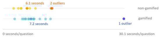 Comparing the average time per question for the entire survey, no significant outliers can be detected at the lower limit that would suggest speeding. Overall, the median of time/question for the non-gamified questions is 1.1 s lower than for the gamified questions, as gamification elements can take up some time to process.