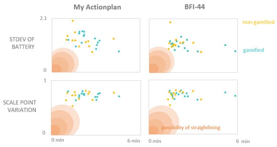 If the Standard Deviation of Battery and the Scale Point Variation are 0, no variation has been detected and the same answer has been chosen for the entire set of questions. The closer to zero and the lower the completion time, the higher the possibility of straight-lining. Figure 7 shows the results for the My Actionplan and BFI-44 surveys. There are no specific outliers visible that indicate straight-lining took place for both the gamified and non-gamified version.