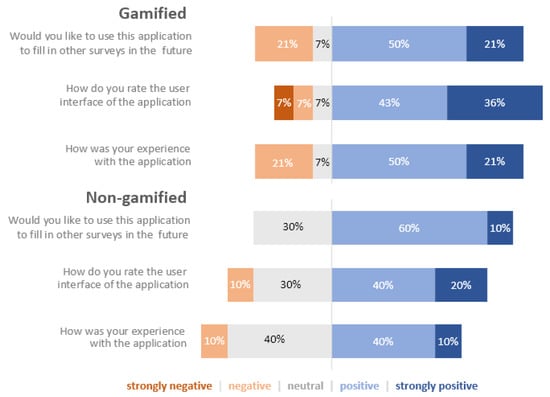 For the second hypothesis, it was hypothesised that the inclusion of gamification would lead to increased data quality. As the application did not allow to skip questions, participants had to complete the survey or quit prematurely, as only 3 participants did (1 × gamified and 2 × non-gamified). Furthermore, the surveys consisted of a significant amount of Likert-scale questions, so a straight-lining analysis was performed as this can indicate the user started to rush through the questions without replying truthfully. For both versions, this analysis did not uncover any significant straight-lining behaviour or any difference between the two versions. Considering this study required participants to fill in a 30 min questionnaire only once, participants might have been on their best behaviour. To provoke such behaviour as straight-lining, a longer survey or periodically filling in the same survey, e.g., during a week, might be required. Nevertheless, more testing with a larger population and different set-up is necessary to research the influence of gamification on data quality. However, the preliminary results indicated that the gamified version leads to a higher user experience, which in turn positively influences data quality as users might be less likely to quit the survey before completion.