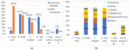 The first characteristic studied was stakeholders’ levels of CE awareness. The first question therein, Q1.1, was used to assess whether participants were familiar with the term ‘Circular Economy’. The results validated the hypothesis that most of the participants (both students and companies) were aware, to some degree, of the CE concept. This is further explained by Figure 1 showing that nearly half (44.4%) of the business respondents were very familiar with the concept. This was as expected since they participated in the ARLI project, as opposed to students of whom only 5.6% understood the concept ‘very well’. Approximately one-third of the students understand the CE well (31.7%) or very well (5.6%) and only a small portion (7.9%) had never heard of it before the CE lecture/course. Most of the students came from either China or Europe, and they were the ones most familiar with the CE concept, whereas students from Africa and the Americas were more likely to have never heard of or be unfamiliar with the term.